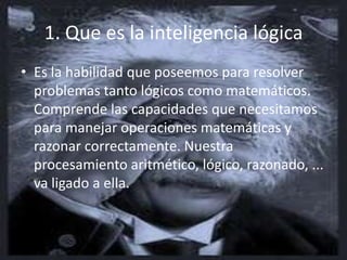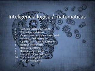 Este documento describe la inteligencia lógica/matemática, incluyendo su definición como la habilidad para resolver problemas lógicos y matemáticos, las competencias básicas como razonar deductiva e inductivamente y operar con conceptos abstractos, y los tipos de personas que más la necesitan como científicos e ingenieros. También discute los estilos de aprendizaje y los 10 tipos de inteligencia descritos por Gardner.