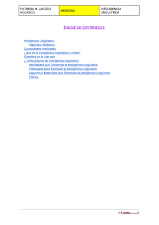 Este documento trata sobre la inteligencia lingüística. Explica que es la capacidad de usar el lenguaje de forma efectiva, oralmente o por escrito, e incluye la habilidad de modificar la sintaxis y semántica. También describe aspectos biológicos del lenguaje, capacidades implicadas, cómo mejorar la inteligencia lingüística a través de la lectura y el uso de recursos literarios, y estrategias y juguetes para estimularla en niños.