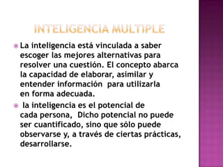 El documento describe las 9 inteligencias múltiples identificadas por Howard Gardner: lingüística, lógico-matemática, musical, espacial, cinético-corporal, interpersonal, intrapersonal, naturalista. Cada inteligencia se define brevemente y se dan ejemplos de cómo pueden desarrollarse.