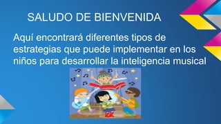 El documento describe estrategias para desarrollar la inteligencia musical en niños, incluyendo cantarles desde bebés, asociar sonidos con objetos, imitar voces, identificar sonidos ambientales, grabar frases de niños pequeños, reconocer canciones y tipos de música. Se dividen las estrategias en etapas por edad de 0-8 meses hasta 5-7 años e incluyen materiales didácticos y formas de evaluar la inteligencia musical.