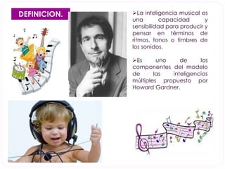 Este documento define la inteligencia musical como la capacidad de producir y pensar en términos de ritmos, tonos y timbres de sonidos. Describe las características de la inteligencia musical como la escucha de música y sonidos, el disfrute de la música y la habilidad para cantar o tocar instrumentos. También explica que ciertas áreas del cerebro están involucradas en la percepción y producción musical y sugiere estrategias como ambientes musicales desde la gestación y experiencias directas con la música para estimular la inteligencia