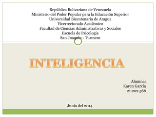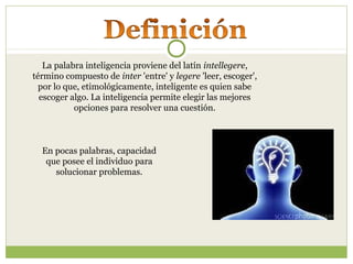 Este documento resume varias teorías sobre la inteligencia, incluyendo las inteligencias múltiples de Howard Gardner que comprende ocho tipos de inteligencia, la teoría triarquica de Sternberg que describe tres categorías de inteligencia, la teoría de Cattell sobre la inteligencia fluida y cristalizada, y la inteligencia emocional propuesta por Goleman. También discute factores como la herencia y el ambiente que afectan el desarrollo de la inteligencia.
