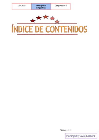 Este documento trata sobre la inteligencia lingüística. Explica que es la capacidad de usar el lenguaje de manera efectiva, oralmente o por escrito, e incluye la habilidad de modificar la sintaxis y semántica. También describe que el área de Broca del cerebro es responsable de la producción de oraciones gramaticales. Por último, proporciona estrategias para estimular la inteligencia lingüística en los niños, como leerles cuentos, cantarles y realizar juegos de vocabulario.