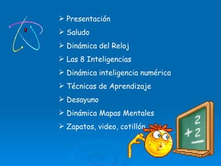 El documento describe las 8 inteligencias identificadas por Howard Gardner: 1) inteligencia lógico-matemática, 2) lingüística, 3) espacial, 4) musical, 5) cinestésico-corporal, 6) naturalista, 7) intrapersonal y 8) interpersonal. Define cada una y ofrece ejemplos de profesiones o personas que destacan en cada una.