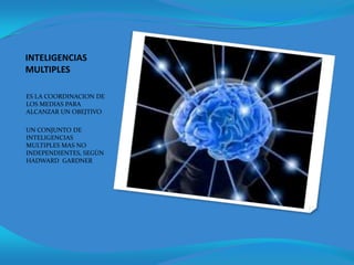 El documento describe las diferentes inteligencias múltiples identificadas por Howard Gardner, incluyendo la inteligencia lingüística, lógico-matemática, espacial, musical, intrapersonal, interpersonal, emocional, naturalista y artificial. Se define cada tipo de inteligencia y se dan ejemplos de personas que destacan en cada una.