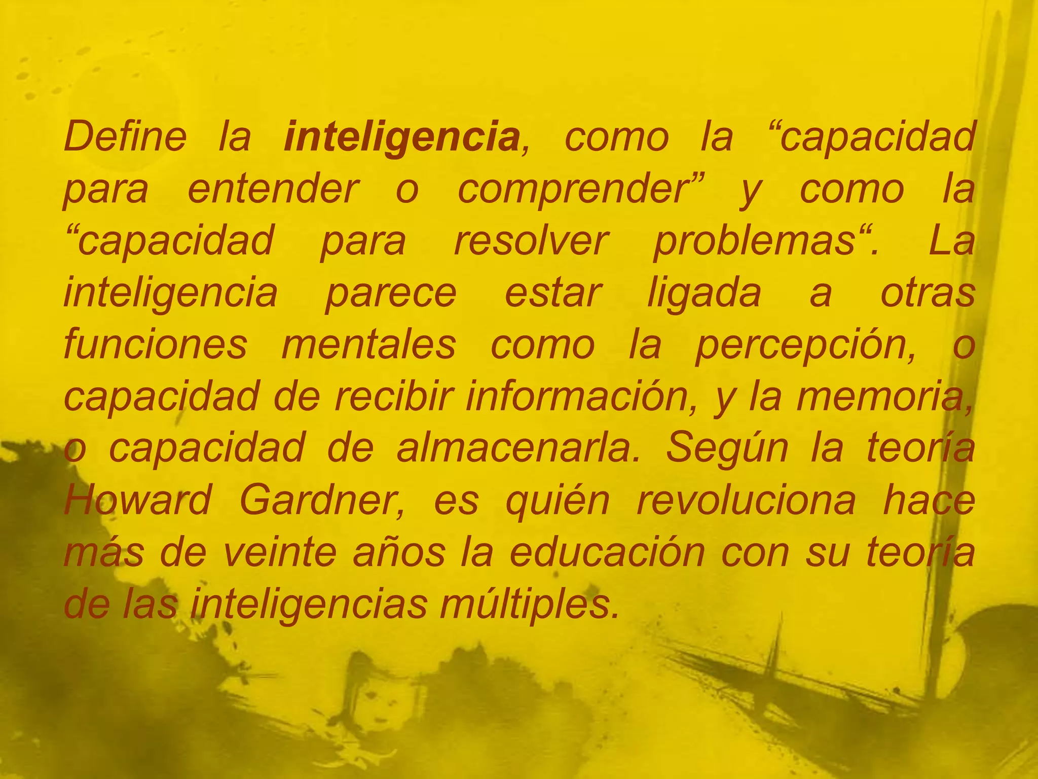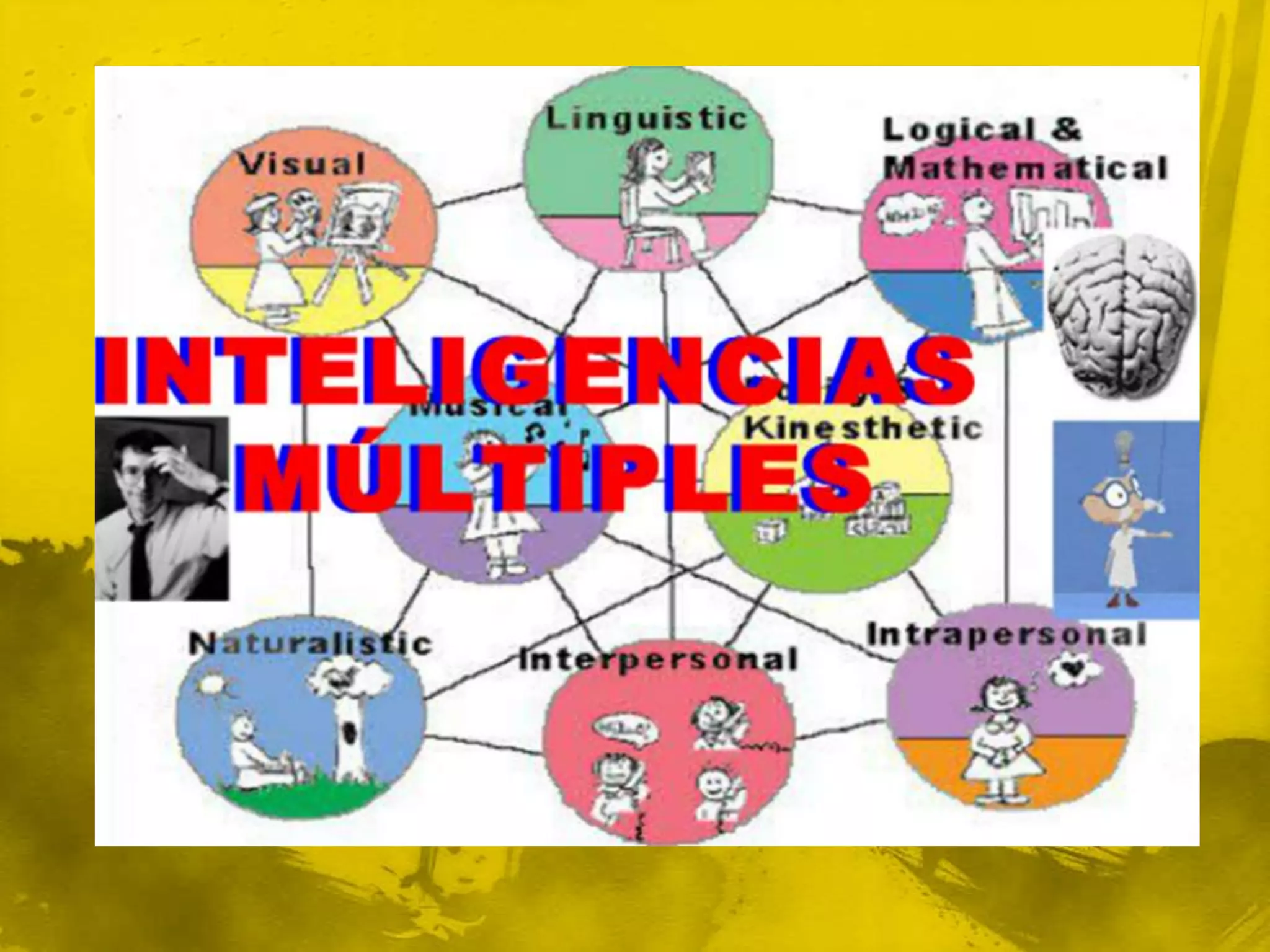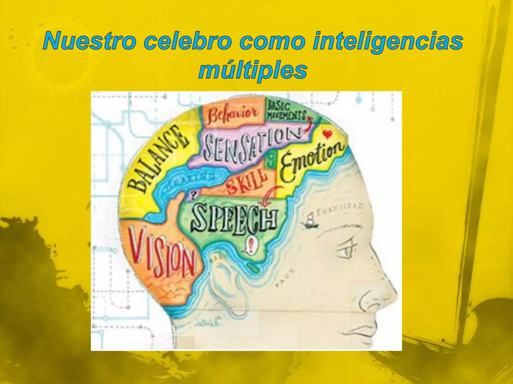 El documento resume la teoría de las inteligencias múltiples de Howard Gardner, la cual propone que los seres humanos tienen ocho tipos diferentes de inteligencia: lingüística, lógico-matemática, espacial, corporal-cinestésica, musical, naturalista, interpersonal e intrapersonal. Cada persona tiene un perfil único de estas inteligencias dependiendo de factores biológicos y de interacción con el ambiente. La teoría también sugiere que las personas deberían desarrollar trabajos acordes a sus mayores habil