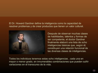 Howard Gardner define la inteligencia como la capacidad de resolver problemas y crear productos de valor cultural, identificando ocho inteligencias básicas que todos los individuos poseen en diversas combinaciones. Estas inteligencias incluyen habilidades lingüísticas, lógico-matemáticas, espaciales, corporal-cinéticas, musicales, interpersonales, intrapersonales y naturalistas, y es crucial reconocerlas desde la infancia para un desarrollo óptimo. El documento critica la educación actual por centrarse demasiado en las inteligencias lingüística y lógico-matemática, dejando de lado otras formas igualmente importantes de inteligencia.