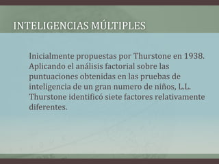 El documento describe las teorías iniciales de las inteligencias múltiples propuestas por Thurstone en 1938 y Gardner en 1980. Thurstone identificó 7 factores de inteligencia diferentes tras analizar las puntuaciones de pruebas de inteligencia de niños. Gardner propuso más tarde que la inteligencia no es unitaria sino múltiple, y definió 8 tipos de inteligencia.