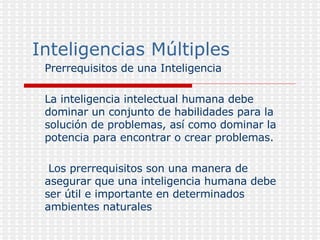 El documento habla sobre la teoría de las inteligencias múltiples de Howard Gardner. Describe las principales inteligencias identificadas por Gardner como lingüística, lógico-matemática, espacial, musical, corporal-cinestésica, interpersonal e intrapersonal. También presenta actividades para fomentar cada una de estas inteligencias y describe las estructuras de aprendizaje colaborativo de Kagan que promueven la interacción social y el desarrollo de habilidades.