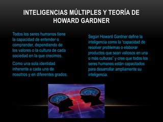 La teoría de las inteligencias múltiples de Howard Gardner propone que los seres humanos poseen múltiples inteligencias como la lingüística, lógico-matemática, musical, espacial, cinestésica corporal, emocional, intrapersonal, interpersonal y naturalista. Cada individuo tiene diferentes grados de estas inteligencias innatas que pueden desarrollarse mediante el estímulo y la práctica. Gardner define la inteligencia como la capacidad de resolver problemas o crear productos valiosos para una o más culturas.