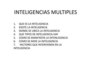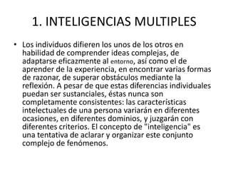 El documento trata sobre las inteligencias múltiples. Explica que existen diferentes tipos de inteligencia como la lingüística, lógico-matemática, musical, espacial, corporal-cinestésica, intrapersonal, interpersonal y naturalista. También describe cómo se manifiesta la inteligencia a través de obras y cómo se mide comúnmente a través de tests de cociente intelectual. Además, señala que factores como la herencia y el medio ambiente influyen en el desarrollo de la inteligencia.