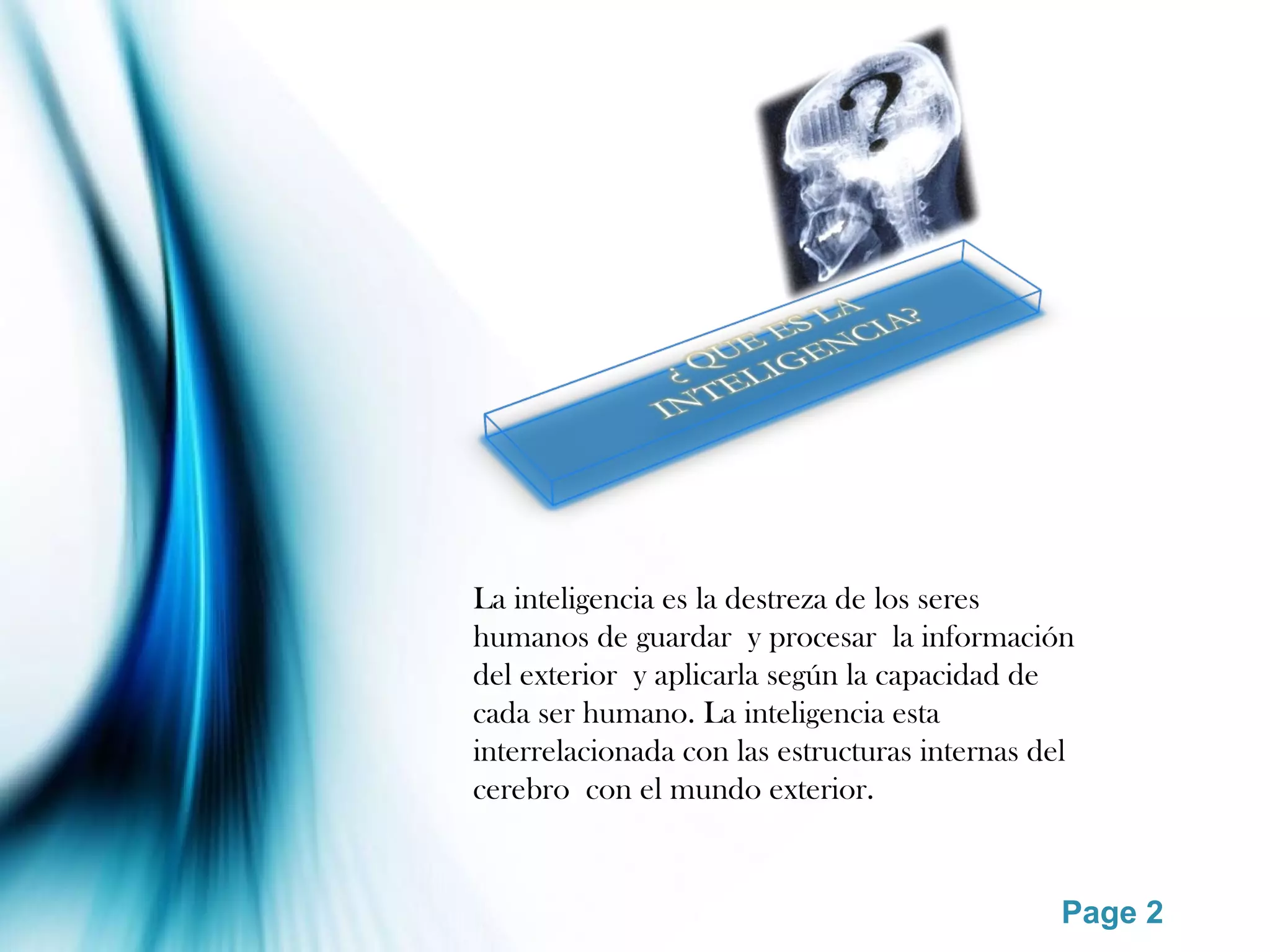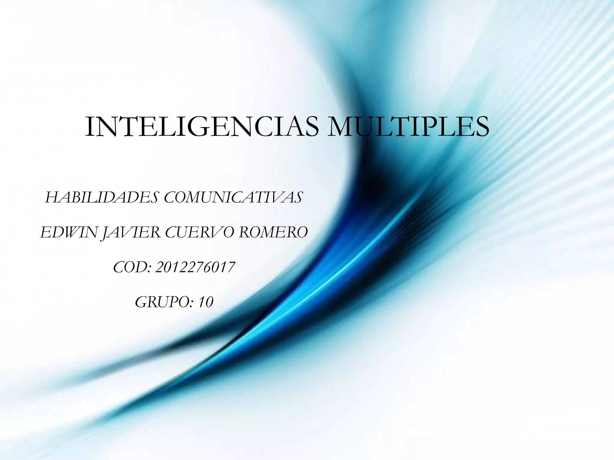 La inteligencia es la capacidad de procesar información del exterior y aplicarla según la capacidad de cada persona. Howard Gardner propuso la teoría de las inteligencias múltiples, identificando 7 tipos: lingüística, lógico-matemática, espacial, musical, corporal cinestésica, intrapersonal e interpersonal. Cada inteligencia se relaciona con aspectos biológicos, capacidades e habilidades específicas así como perfiles profesionales.
