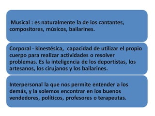 El documento presenta las ocho inteligencias múltiples descritas por Howard Gardner: lingüística, lógico-matemática, espacial, corporal-kinestésica, musical, interpersonal, intrapersonal y naturalista. Para cada inteligencia, se describen características clave, preferencias de aprendizaje y ejemplos de actividades en el aula que podrían desarrollarlas. El documento concluye resaltando que reconocer las diferentes inteligencias de cada persona mejora las oportunidades de manejar problemas de manera adecu