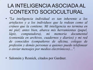 Este documento presenta un resumen de la teoría de las inteligencias múltiples propuesta por Howard Gardner. Identifica ocho tipos de inteligencia: musical, corporal-cinética, lógico-matemática, verbal-lingüística, espacial, interpersonal, intrapersonal y naturalista. Para cada una describe sus características principales, actividades para fomentarlas y perfiles profesionales relacionados. El documento concluye con una lista de actividades para desarrollar la inteligencia interpersonal.