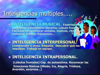 El documento discute las inteligencias múltiples según la teoría de Howard Gardner. Describe ocho tipos de inteligencia, incluyendo la lingüística, lógico-matemática, espacial, corporal, musical, interpersonal e intrapersonal. Además, explica que cada tipo de inteligencia se desarrolla principalmente durante una "ventana de oportunidad" en la infancia y se relaciona con regiones específicas del cerebro.