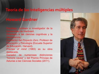 El documento describe la teoría de las inteligencias múltiples del psicólogo Howard Gardner. Sostiene que la inteligencia no es unidimensional sino plural, y propone que existen 7 tipos principales de inteligencia: lingüística, lógico-matemática, espacial, corporal-cinética, musical, interpersonal e intrapersonal. Esto contrasta con la visión tradicional de medir la inteligencia a través de tests estandarizados. La teoría busca repensar los sistemas de aprendizaje y evaluación