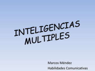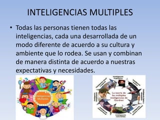 Este documento describe las ocho inteligencias múltiples identificadas por Howard Gardner: lingüística, lógico-matemática, espacial, musical, corporal-cinéstica, intrapersonal, interpersonal y naturalista. Explica que todas las personas poseen estas inteligencias en diferentes grados y las usan de manera distinta según su cultura y ambiente. Además, señala que en la práctica una persona suele combinar varias inteligencias para realizar sus tareas de manera efectiva.