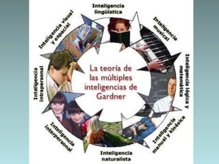 El documento presenta las diferentes teorías de inteligencias múltiples propuestas por Howard Gardner, incluyendo la inteligencia lingüística, lógico-matemática, espacial, musical, corporal, intrapersonal, naturalista e inteligencia artificial. Gardner propuso que la inteligencia no es algo unitario sino un conjunto de capacidades específicas diferentes e independientes.