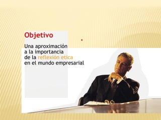 El documento presenta una introducción a la importancia de la ética empresarial. Define conceptos como moral, valores y ética, y explica cómo instalar la reflexión ética en la cultura organizacional mediante la discusión de dilemas morales. También describe los beneficios que trae la ética empresarial tanto para las empresas como para la sociedad, y presenta datos sobre corrupción y fraude corporativo.