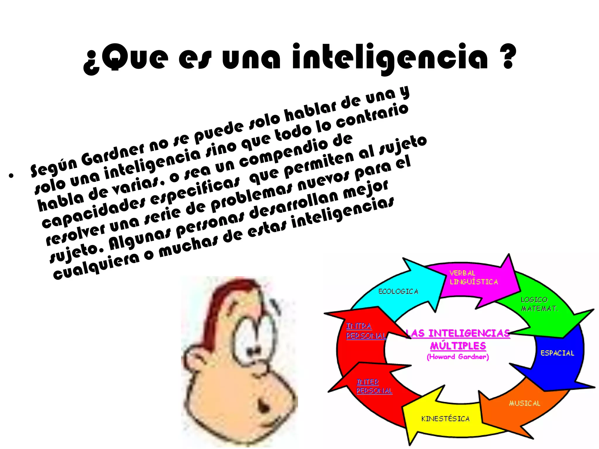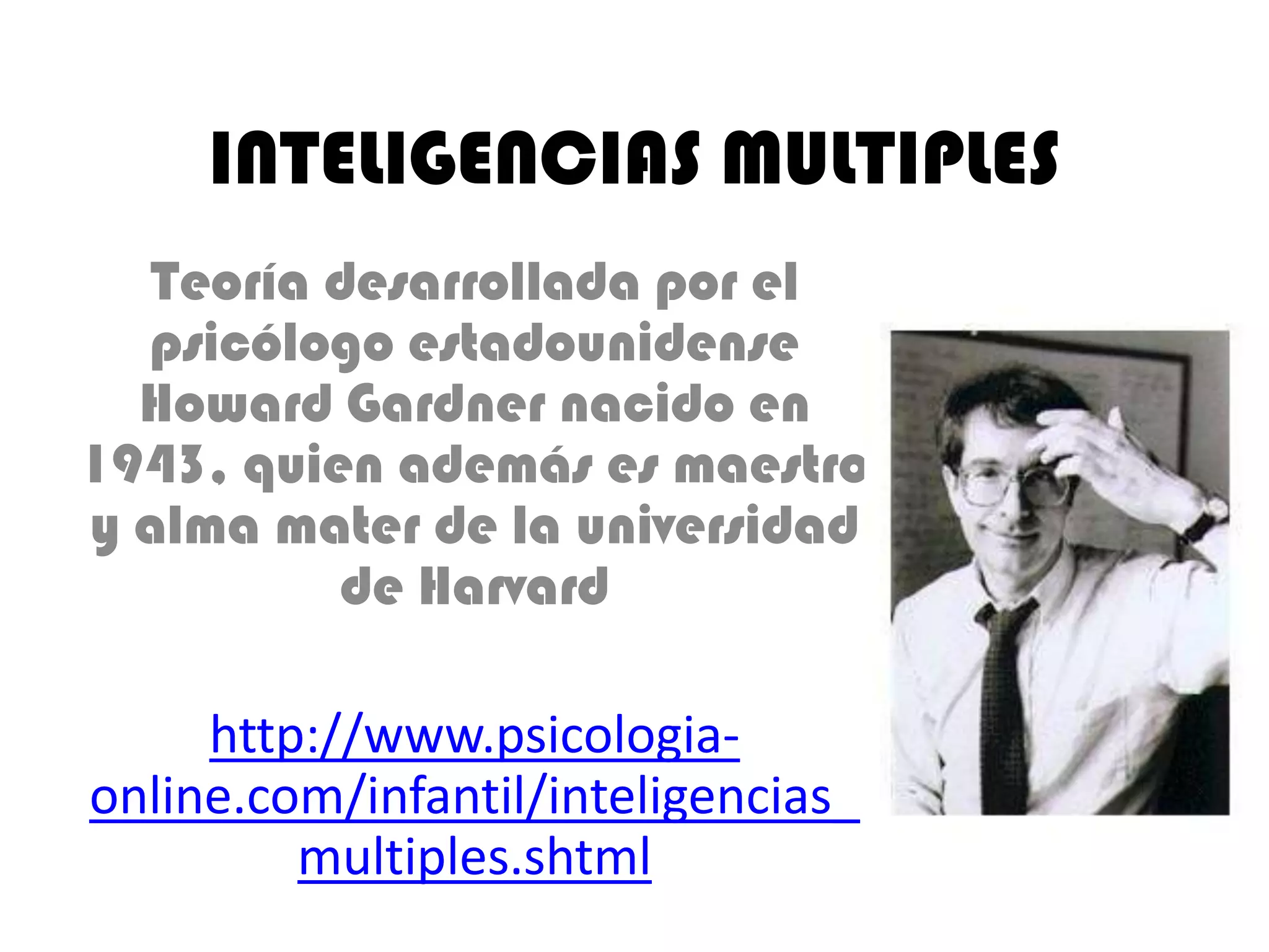El documento describe la teoría de las inteligencias múltiples desarrollada por el psicólogo estadounidense Howard Gardner, que identifica varios tipos de inteligencia como la lingüística, lógico-matemática, espacial, musical, corporal-cinética, intrapersonal e interpersonal.