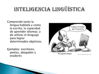 Comprende tanto lalengua hablada y como la escrita, la capacidad de aprender idiomas; y de utilizar el lenguaje para lograr determinados objetivos.Ejemplos: escritores, poetas, abogados y oradores Inteligencia Lingüística
