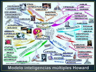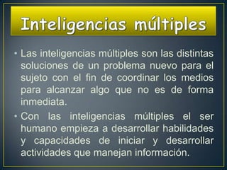 Las inteligencias múltiples se refieren a las diferentes habilidades y capacidades que posee cada persona para resolver problemas y desarrollar actividades. Incluyen inteligencias lingüística, lógico-matemática, espacial, musical, corporal-cinestésica, interpersonal e intrapersonal. Cada persona desarrolla estas inteligencias a niveles diferentes.