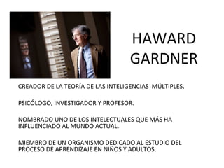 El documento presenta la teoría de las inteligencias múltiples de Howard Gardner, que propone que cada persona posee ocho tipos de inteligencia que funcionan de forma autónoma pero en conjunto. Estas inteligencias incluyen la lingüística, lógico-matemática, visual-espacial, musical, intrapersonal, interpersonal, cinética-corporal y naturalista. Para cada inteligencia se describen sus características principales y ejemplos de profesiones relacionadas.