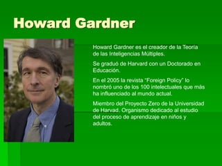 El documento describe la teoría de las inteligencias múltiples de Howard Gardner, que propone que los humanos poseen al menos nueve tipos de inteligencia distintos. Explica cada una de las inteligencias identificadas por Gardner, incluyendo inteligencias lógico-matemática, espacial, corporal-kinestésica, musical, interpersonal, intrapersonal y naturalista. Finalmente, argumenta que considerar las múltiples inteligencias puede mejorar la enseñanza y el aprendizaje.