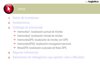 Este documento presenta las soluciones de localización y movilidad de una empresa llamada Gestión Electrónica Logística. Ofrece servicios como la localización de teléfonos móviles por celda o GPS, el seguimiento de flotas con GPS-GPRS y la integración con sistemas del cliente. Detalla varios productos como Intemoviles1, IntemovilesGPS e IflotasGPS, así como las ventajas de su hardware y software.