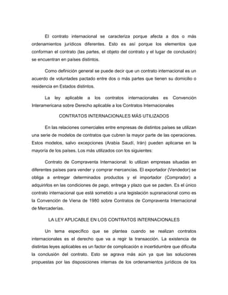 Este documento describe varios tipos de contratos internacionales, incluyendo contratos de compraventa, transporte, trabajo y más. Explica que un contrato internacional involucra partes de diferentes países y está sujeto a más de un ordenamiento jurídico. Además, discute temas como la ley aplicable y los organismos internacionales que trabajan para armonizar las leyes entre países.