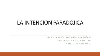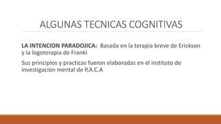 Este documento describe la técnica cognitiva de la intención paradójica, basada en la terapia breve de Erickson y la logoterapia de Frankl. Explica los 12 principios básicos de esta técnica, incluyendo olvidar la comprensión, determinar el ciclo síntoma-solución, prescribir el síntoma, predecir una recaída y terminar cuando el paciente es capaz de aplicar las técnicas por sí mismo. El objetivo general es romper el círculo vicioso de síntoma-sol