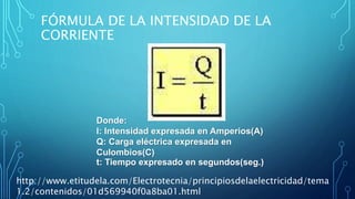 La intensidad de la corriente, también llamada corriente de conducción, se define como la velocidad a la que se transporta la carga eléctrica por un punto dado en un sistema conductor. Se expresa mediante la fórmula I=Q/t, donde I es la intensidad en amperios, Q la carga eléctrica transportada en coulombs y t el tiempo en segundos. Las unidades del SI para medir la intensidad de corriente son el amperio y sus múltiplos como el kiloamperio y los submúltiplos como el miliamperio
