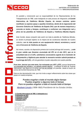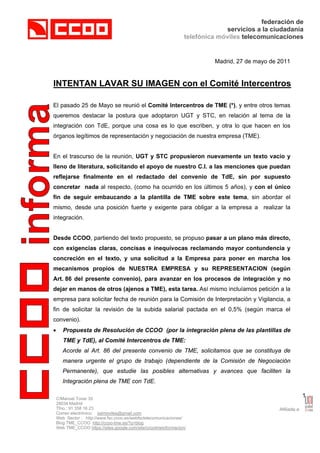 El sindicato CCOO propuso en la reunión del Comité Intercentros de TME demandas más claras y concretas para la integración de las plantillas de TME y TdE, así como una revisión salarial del 0.5% acordado. Sin embargo, UGT y STC rechazaron la propuesta de CCOO y prefirieron mantener un texto vago sin compromisos reales. CCOO critica que UGT y STC engañan a los trabajadores sobre la integración al no abordar el tema de forma exigente.