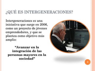 Intergeneraciones es una iniciativa que promueve el envejecimiento activo y las relaciones intergeneracionales a través del uso de nuevas tecnologías. Ha recibido varios premios por su innovación y ofrece una revista y página web con contenido sobre salud, cultura, ocio y tecnología para personas mayores. Además, desarrolla proyectos como un "Living Lab" para fomentar la participación ciudadana de personas mayores en zonas rurales.