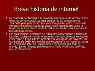 La historia de Internet se remonta al desarrollo temprano de las redes de comunicación en la década de 1950. En la década de 1980 comenzaron a expandirse tecnologías que reconoceríamos como la base de la Internet moderna. En los años 1990 se introdujo la World Wide Web, que permitió una forma gráfica de explorar Internet. Protocolos como HTTP y URLs permitieron la transferencia de información entre computadoras conectadas a través de Internet.