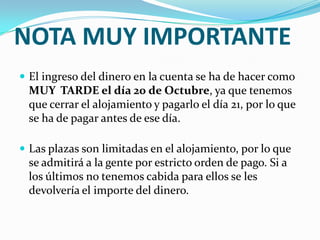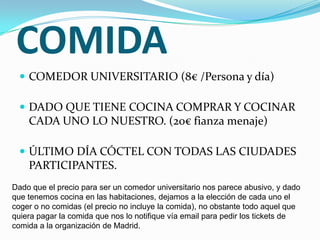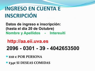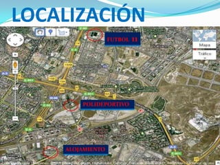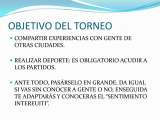El documento proporciona información sobre el torneo deportivo interuniversitario Inter-E.U.I.T.I. Madrid'11, el cual incluye varios deportes como fútbol, voleibol, baloncesto y tenis de mesa. Se llevará a cabo entre las ciudades de Barcelona, Málaga, Madrid, Valencia y Valladolid en las instalaciones del Polideportivo Campus Sur-UPM y el Centro Polideportivo de Valdebernardo del 21 al 23 de octubre. El alojamiento y comidas estarán disponibles para
