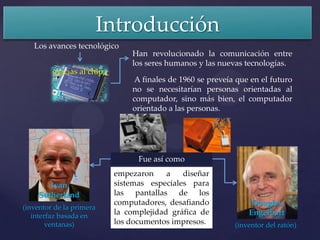 Este documento trata sobre la interacción humano-computador y la importancia del diseño de interfaces de aplicaciones. Explica que la interacción humano-computador estudia el proceso de comunicación entre el usuario y la computadora, considerando los componentes del sistema como el usuario, el computador y la interfaz. Resalta que una interfaz bien diseñada minimiza las acciones del usuario y facilita la ubicación de información relevante, mejorando la experiencia del usuario.