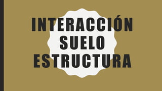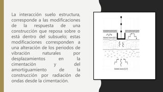 El documento trata sobre la interacción entre el suelo y la estructura. Explica que existen dos tipos principales de interacción: la interacción inercial debido a la vibración de la estructura, y la interacción cinemática causada por los movimientos incoherentes del terreno. También describe diferentes métodos para modelar dinámicamente la interacción suelo-estructura, incluyendo el uso de resortes y amortiguadores. Finalmente, discute la importancia de una unión rígida entre muros y columnas para que trabajen