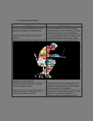Este documento resume los principales períodos de desarrollo tecnológico y las invenciones significativas de cada uno, así como sus efectos estructurales. También discute las ventajas y desventajas de la tecnología, así como posibles soluciones a las desventajas. La conclusión es que la tecnología ha mejorado el mundo pero también lo ha destruido al reemplazar el trabajo humano y hacer que las personas sean menos inteligentes e inútiles.