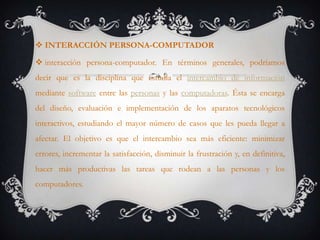 El documento trata sobre la interacción persona-computador. Explica que estudia el intercambio de información entre personas y computadoras mediante software. Su objetivo es hacer más eficiente esta interacción minimizando errores y aumentando la satisfacción del usuario. También describe los componentes clave de un sistema de interacción persona-computador como el usuario, la computadora y el origen del proceso interactivo.