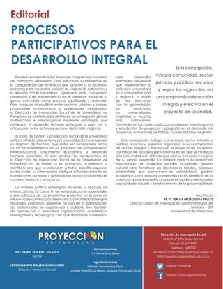 El documento describe las actividades de la Universidad de Pamplona para promover el desarrollo sostenible de la región a través de la interacción social, incluyendo la limpieza de áreas de la ciudad con otras instituciones y la firma de convenios con universidades para ofrecer un doctorado interinstitucional en educación y cultura ambiental. También se firmó un convenio con una institución canadiense para enseñar inglés y francés a la comunidad universitaria.