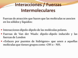 Este documento describe las diferentes fuerzas intermoleculares que causan que las moléculas se asocien en los sólidos y líquidos, incluyendo las interacciones dipolo-dipolo, las fuerzas de Van der Waals, y los puentes de hidrógeno. Explica cómo estas fuerzas, como las fuerzas de London y los puentes de hidrógeno, afectan las propiedades como los puntos de ebullición de los compuestos.