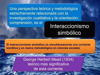 1) El documento describe la perspectiva teórica y metodológica del interaccionismo simbólico. 2) El interaccionismo simbólico se centra en la importancia de los significados y la interpretación que surgen de la interacción social. 3) Enfatiza que la conducta individual está moldeada por la interacción social más que por fuerzas externas.