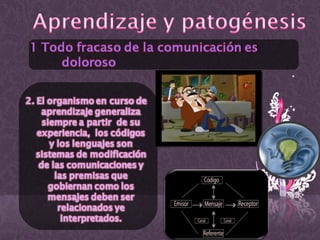 El documento describe cómo la distorsión de la realidad psicótica coloca al receptor en una situación insostenible donde se siente equivocada pero no culpable. Los mensajes psicóticos tienen una estructura reflexiva negativa que niega lo que afirma y afirma lo que niega. Nadie puede permanecer sano comunicándose solo consigo mismo.