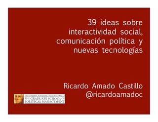 Este documento presenta 39 ideas sobre interactividad social, comunicación política y nuevas tecnologías. Cubre temas como campañas en línea, estrategias de posicionamiento, audiencias objetivo, uso de redes sociales, y casos de estudio de campañas pasadas en Estados Unidos. El autor argumenta que las nuevas tecnologías permiten una comunicación más directa con los ciudadanos y una respuesta más rápida a los eventos, y proporciona consejos sobre cómo los políticos y activistas pueden aprovechar mejor estas herramientas.