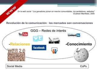 El documento explora la transformación de la comunicación y el marketing en la era de la web social, destacando la importancia de la creación de comunidades y la colaboración a través del crowdsourcing. Se mencionan ejemplos como Goldcorp Inc., que aplica principios de colaboración abierta para innovar y mejorar su producción. Además, se enfatiza el valor de la información compartida y la transparencia en la creación de confianza con los consumidores.
