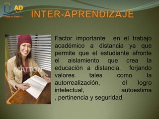 Este documento describe los métodos de aprendizaje colaborativo y tutoría para estudiantes de educación a distancia. El aprendizaje colaborativo permite que estudiantes aísldos interactúen y se apoyen mutuamente, mientras que la tutoría guía a los estudiantes en su proceso de aprendizaje y les brinda estrategias y orientación. El documento también explica diferentes tipos de tutoría según el número de estudiantes, modo de realizarse y propósito.
