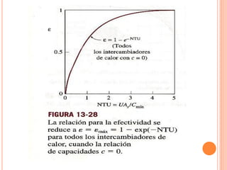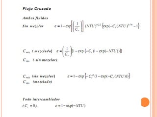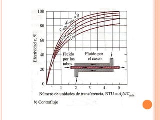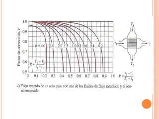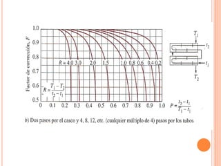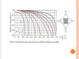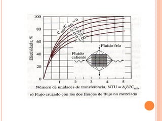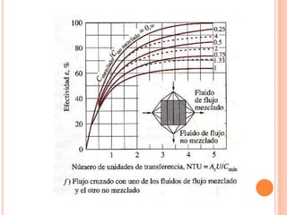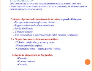 Un intercambiador de calor es un equipo que transfiere calor entre dos fluidos separados por una pared metálica. Existen varios tipos clasificados según su construcción, disposición de los fluidos o función. El coeficiente global de transferencia de calor depende de factores como la geometría, suciedad y variación de la temperatura a lo largo del intercambiador.
