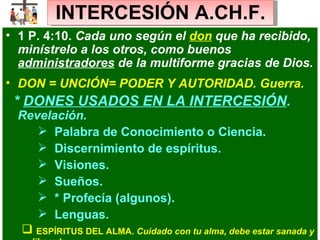 El documento habla sobre la intercesión. Explica que la intercesión es un diálogo de petición a favor de alguien o algo, no es un don sino una unción. Todos debemos interceder y los líderes son intercesores. Para interceder se necesita tener un corazón limpio y obediente, seguir la guía de Dios, interceder bíblica y positivamente de forma corta y perseverante. También señala que la intercesión requiere una vida de ayuno regular.