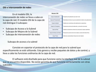 El documento describe diferentes dispositivos de interconexión de redes como repetidores, HUBs, bridges, switches, routers y gateways. Explica sus funciones a nivel de las capas OSI y sus características principales como la forma en que transmiten datos, su escalabilidad y complejidad.